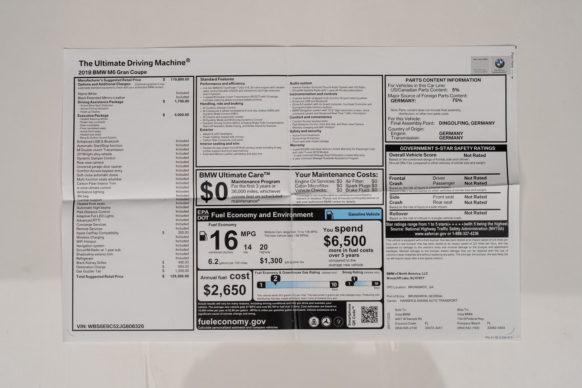 Welcome to TxtCharlie, your go-to place for purchasing cars in Fort Lauderdale. Our showroom is located at 2125 S Federal Highway, Fort Lauderdale, FL 33316, just 5 minutes from Fort Lauderdale Airport. We make out-of-state sales easy with nationwide shipping. To help you get a better feel for our inventory, we offer Facetime calls for virtual tours. Our reputation speaks for itself with over 900 Google reviews at 5 stars. We offer competitive, no-haggle pricing to take the stress out of buying a car. Our dealer fee is $1,399. Drop by to see our collection, and let us make your car-buying experience smooth and enjoyable. Private Tag Agency Fee of $399 in Florida State or $499 out of State.Alpine White 2018 BMW M6 Gran Coupe RWD 7-Speed Automatic 4.4L V8 32V DOHC TwinPower TurboRecent Arrival! Odometer is 27968 miles below market average!