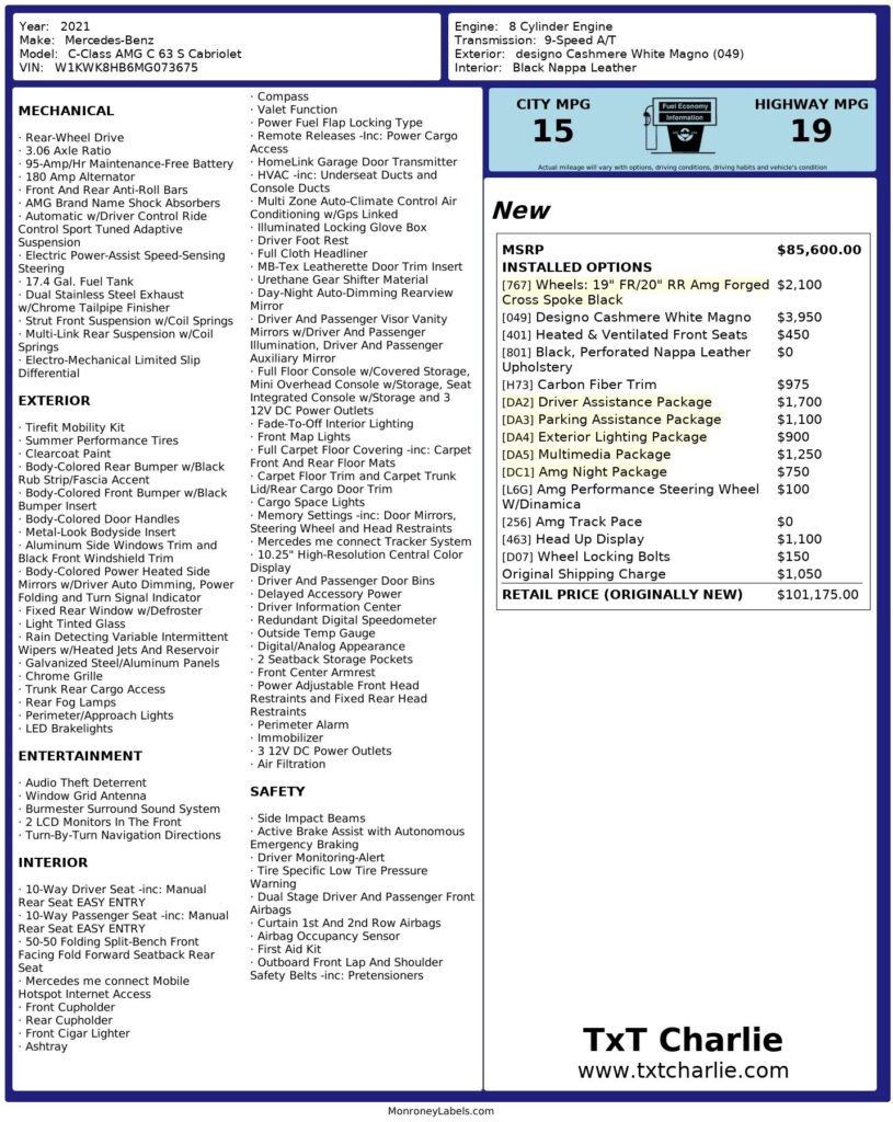 Welcome to TxtCharlie, your go-to place for purchasing cars in Fort Lauderdale. Our showroom is located at 2125 S Federal Highway, Fort Lauderdale, FL 33316, just 5 minutes from Fort Lauderdale Airport. We make out-of-state sales easy with nationwide shipping. To help you get a better feel for our inventory, we offer Facetime calls for virtual tours. Our reputation speaks for itself with over 800 Google reviews at 5 stars. We offer competitive, no-haggle pricing to take the stress out of buying a car. Our dealer fee is $1,399. Drop by to see our collection, and let us make your car-buying experience smooth and enjoyable. Private Tag Agency Fee of $399 in Florida State or $499 out of State.MSRP: $85,600.00Installed Options:- [767] Wheels: 19″ Front / 20″ Rear AMG Forged Cross Spoke Black $2,100 – [049] Designo Cashmere White Magno $3,950 – [401] Heated & Ventilated Front Seats $450 – [801] Black, Perforated Nappa Leather Upholstery Included – [H73] Carbon Fiber Trim $975 – [DA2] Driver Assistance Package $1,700 – [DA3] Parking Assistance Package $1,100 – [DA4] Exterior Lighting Package $900 – [DA5] Multimedia Package $1,250 – [DC1] AMG Night Package $750 – [L6G] AMG Performance Steering Wheel w/ DINAMICA $100 – [256] AMG Track Pace Included – [463] Head Up Display $1,100 – [D07] Wheel Locking Bolts $150 Original Shipping Charge: $1,050.00 **Retail Price (Originally New): $101,175.00**White 2021 Mercedes-Benz C-Class C 63 S AMG® RWD 9-Speed Automatic 4.0L V8Recent Arrival!
