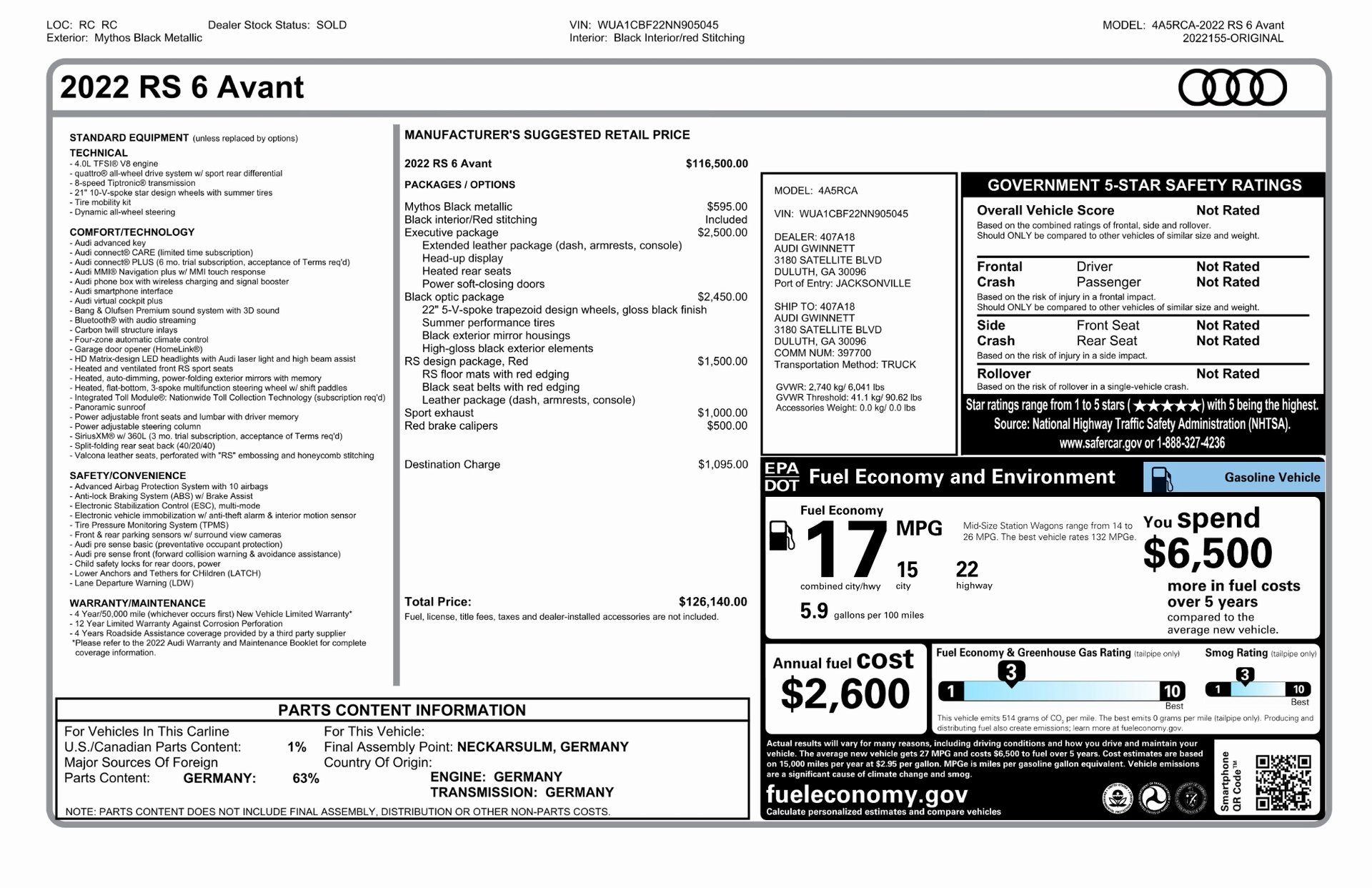 Welcome to TxtCharlie, your go-to place for purchasing cars in Fort Lauderdale. Our showroom is located at 2125 S Federal Highway, Fort Lauderdale, FL 33316, just 5 minutes from Fort Lauderdale Airport. We make out-of-state sales easy with nationwide shipping. To help you get a better feel for our inventory, we offer Facetime calls for virtual tours. Our reputation speaks for itself with over 1000 Google reviews at 5 stars. We offer competitive, no-haggle pricing to take the stress out of buying a car. Our dealer fee is $1,399. Drop by to see our collection, and let us make your car-buying experience smooth and enjoyable. Private Tag Agency Fee of $399 in Florida State or $499 out of State.Black 2022 Audi RS 6 4.2 quattro quattro 8-Speed Automatic with Tiptronic 4.0L V8 Turbocharged DOHC 32V LEV3-ULEV125 591hpRecent Arrival! Odometer is 4428 miles below market average!ADDED OPTIONS