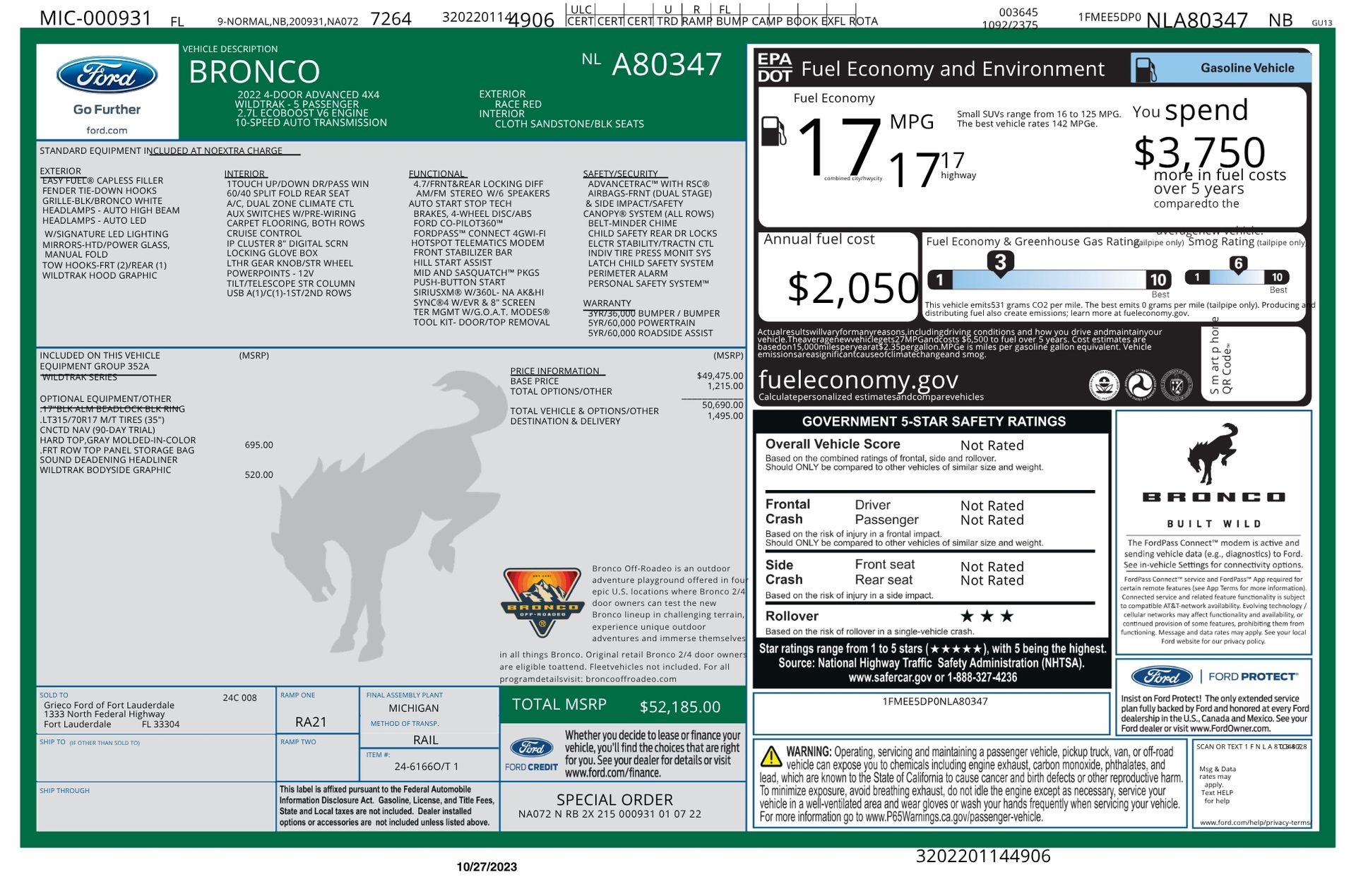 Welcome to TxtCharlie, your go-to place for purchasing cars in Fort Lauderdale. Our showroom is located at 2125 S Federal Highway, Fort Lauderdale, FL 33316, just 5 minutes from Fort Lauderdale Airport. We make out-of-state sales easy with nationwide shipping. To help you get a better feel for our inventory, we offer Facetime calls for virtual tours. Our reputation speaks for itself with over 1000 Google reviews at 5 stars. We offer competitive, no-haggle pricing to take the stress out of buying a car. Our dealer fee is $1,399. Drop by to see our collection, and let us make your car-buying experience smooth and enjoyable. Private Tag Agency Fee of $399 in Florida State or $499 out of State.Race Red 2022 Ford Bronco Wildtrak 4WD 10-Speed Automatic 2.7L EcoBoost V6Recent Arrival!Awards: * NACTOY 2022 North American Utility of the YearADDED OPTIONS