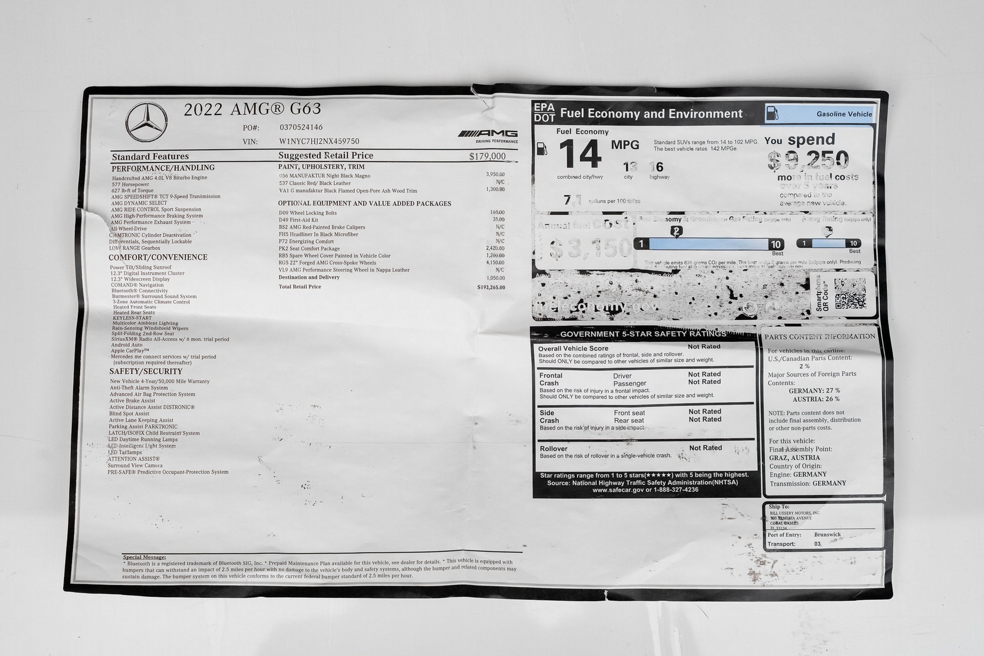 Welcome to TxtCharlie, your go-to place for purchasing cars in Fort Lauderdale. Our showroom is located at 2125 S Federal Highway, Fort Lauderdale, FL 33316, just 5 minutes from Fort Lauderdale Airport. We make out-of-state sales easy with nationwide shipping. To help you get a better feel for our inventory, we offer Facetime calls for virtual tours. Our reputation speaks for itself with over 1000 Google reviews at 5 stars. We offer competitive, no-haggle pricing to take the stress out of buying a car. Our dealer fee is $1,399. Drop by to see our collection, and let us make your car-buying experience smooth and enjoyable. Private Tag Agency Fee of $399 in Florida State or $499 out of State.Clean CARFAX. CARFAX One-Owner. Black 2022 Mercedes-Benz G-Class G 63 AMG® 4MATIC® 4MATIC® 9-Speed Automatic V8Recent Arrival!