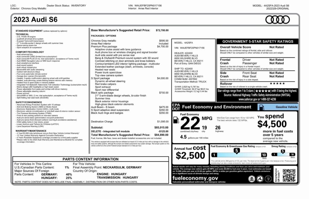 Welcome to TxtCharlie, your go-to place for purchasing cars in Fort Lauderdale. Our showroom is located at 2125 S Federal Highway, Fort Lauderdale, FL 33316, just 5 minutes from Fort Lauderdale Airport. We make out-of-state sales easy with nationwide shipping. To help you get a better feel for our inventory, we offer Facetime calls for virtual tours. Our reputation speaks for itself with over 1000 Google reviews at 5 stars. We offer competitive, no-haggle pricing to take the stress out of buying a car. Our dealer fee is $1,399. Drop by to see our collection, and let us make your car-buying experience smooth and enjoyable. Private Tag Agency Fee of $399 in Florida State or $499 out of State.CARFAX One-Owner. Gray Metallic 2023 Audi S6 2.9T Premium Plus quattro quattro 8-Speed Automatic with Tiptronic 2.9L V6 Turbocharged DOHC 24V LEV3-ULEV70 444hpRecent Arrival!