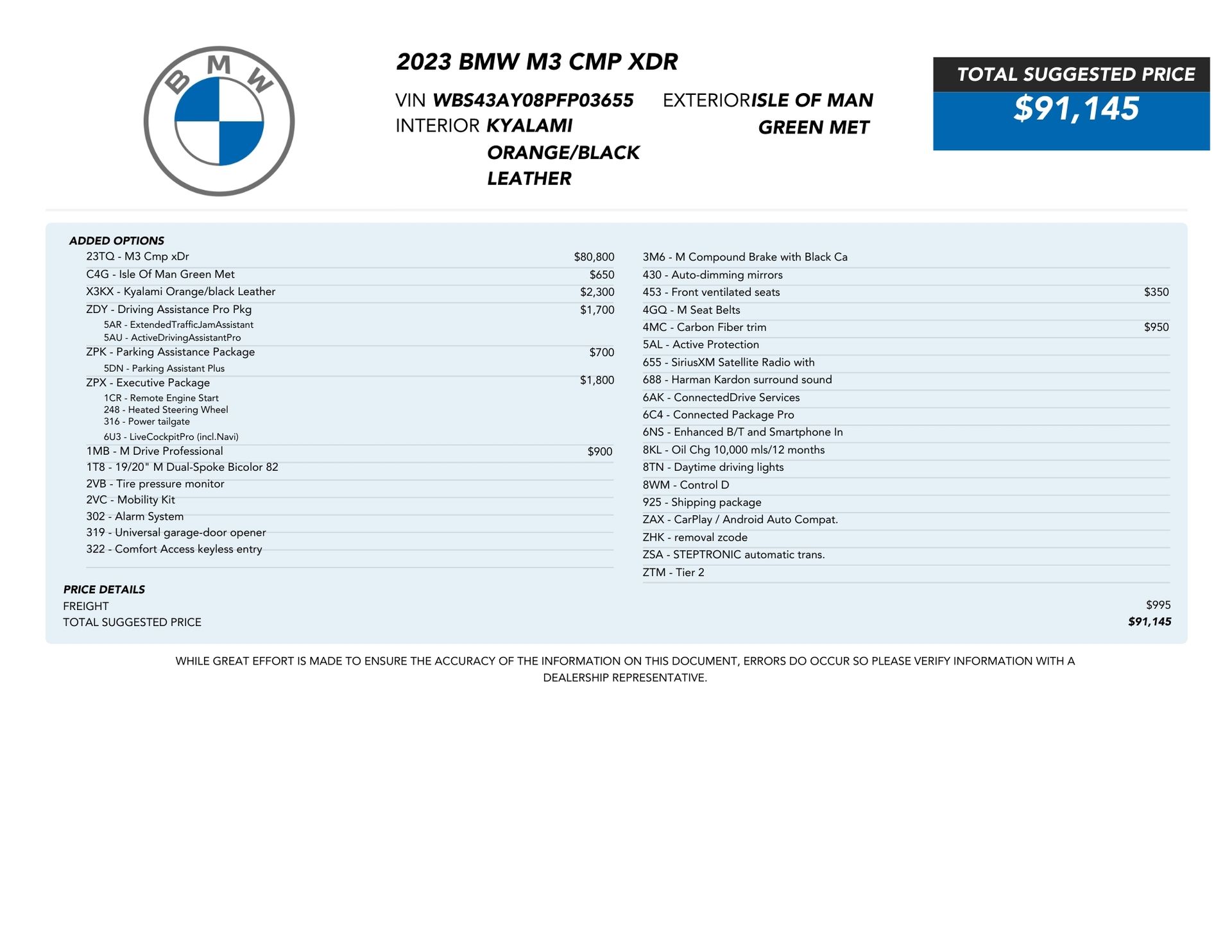 Welcome to TxtCharlie, your go-to place for purchasing cars in Fort Lauderdale. Our showroom is located at 2125 S Federal Highway, Fort Lauderdale, FL 33316, just 5 minutes from Fort Lauderdale Airport. We make out-of-state sales easy with nationwide shipping. To help you get a better feel for our inventory, we offer Facetime calls for virtual tours. Our reputation speaks for itself with over 1000 Google reviews at 5 stars. We offer competitive, no-haggle pricing to take the stress out of buying a car. Our dealer fee is $1,399. Drop by to see our collection, and let us make your car-buying experience smooth and enjoyable. Private Tag Agency Fee of $399 in Florida State or $499 out of State.Isle of Man Green Metallic 2023 BMW M3 Competition AWD 8-Speed Automatic Steptronic 3.0L I6 Turbocharged DOHC 24V LEV3-ULEV70 503hpRecent Arrival!ADDED OPTIONS