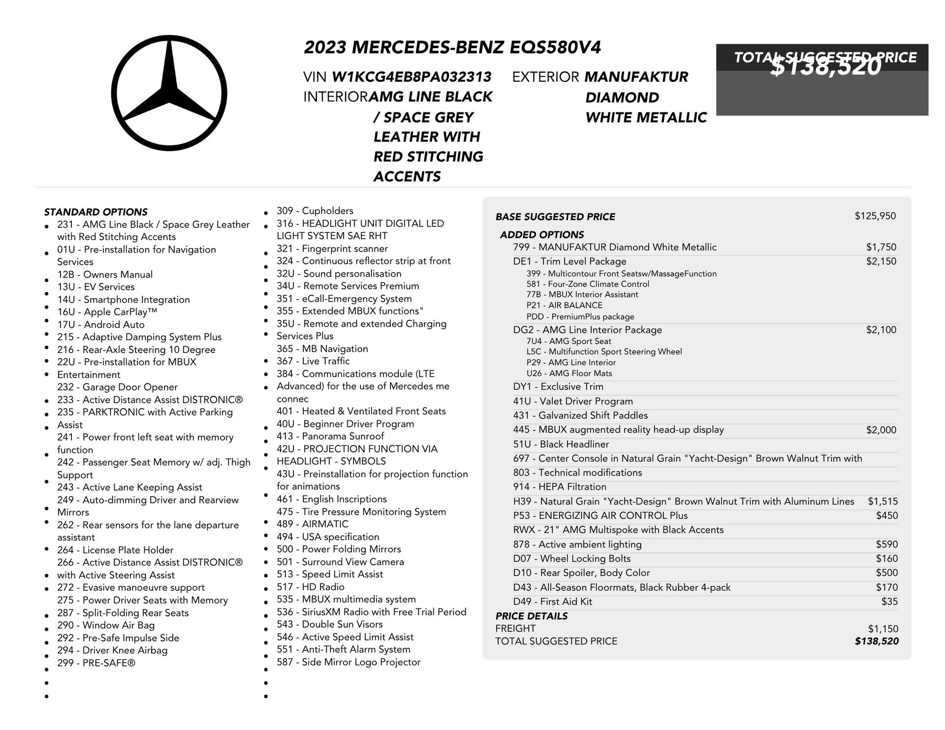 Welcome to TxtCharlie, your go-to place for purchasing cars in Fort Lauderdale. Our showroom is located at 2125 S Federal Highway, Fort Lauderdale, FL 33316, just 5 minutes from Fort Lauderdale Airport. We make out-of-state sales easy with nationwide shipping. To help you get a better feel for our inventory, we offer Facetime calls for virtual tours. Our reputation speaks for itself with over 1000 Google reviews at 5 stars. We offer competitive, no-haggle pricing to take the stress out of buying a car. Our dealer fee is $1,399. Drop by to see our collection, and let us make your car-buying experience smooth and enjoyable. Private Tag Agency Fee of $399 in Florida State or $499 out of State.Clean CARFAX. CARFAX One-Owner. White 2023 Mercedes-Benz EQS 580 4MATIC® 4MATIC® 1-Speed Automatic Electric Motor