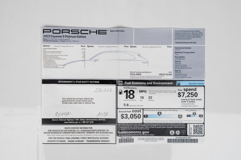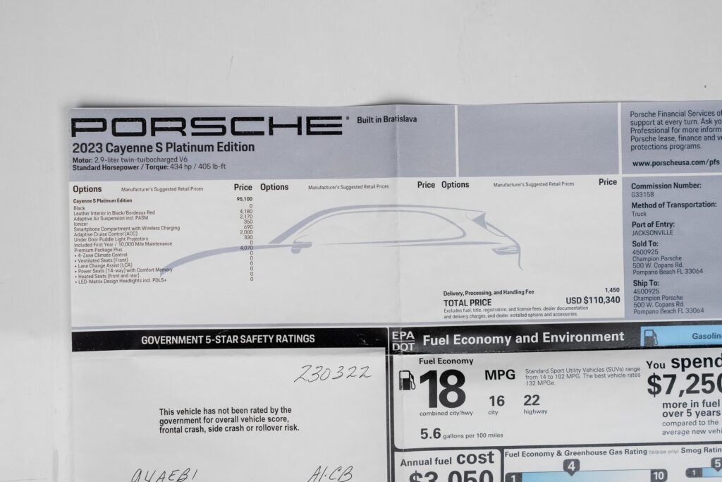 Welcome to TxtCharlie, your go-to place for purchasing cars in Fort Lauderdale. Our showroom is located at 2125 S Federal Highway, Fort Lauderdale, FL 33316, just 5 minutes from Fort Lauderdale Airport. We make out-of-state sales easy with nationwide shipping. To help you get a better feel for our inventory, we offer Facetime calls for virtual tours. Our reputation speaks for itself with over 1000 Google reviews at 5 stars. We offer competitive, no-haggle pricing to take the stress out of buying a car. Our dealer fee is $1,399. Drop by to see our collection, and let us make your car-buying experience smooth and enjoyable. Private Tag Agency Fee of $399 in Florida State or $499 out of State.Clean CARFAX. CARFAX One-Owner. Black 2023 Porsche Cayenne S AWD 8-Speed Automatic with Tiptronic 2.9L V6Red Leather.