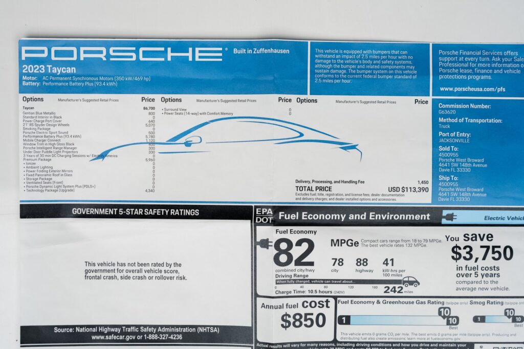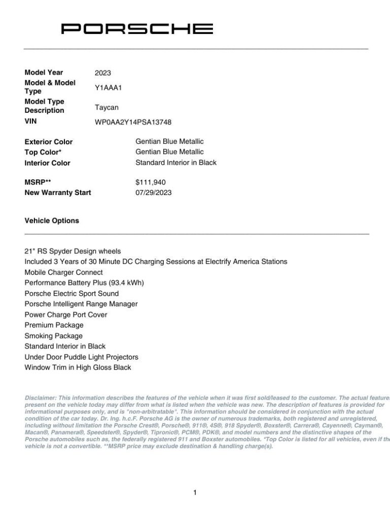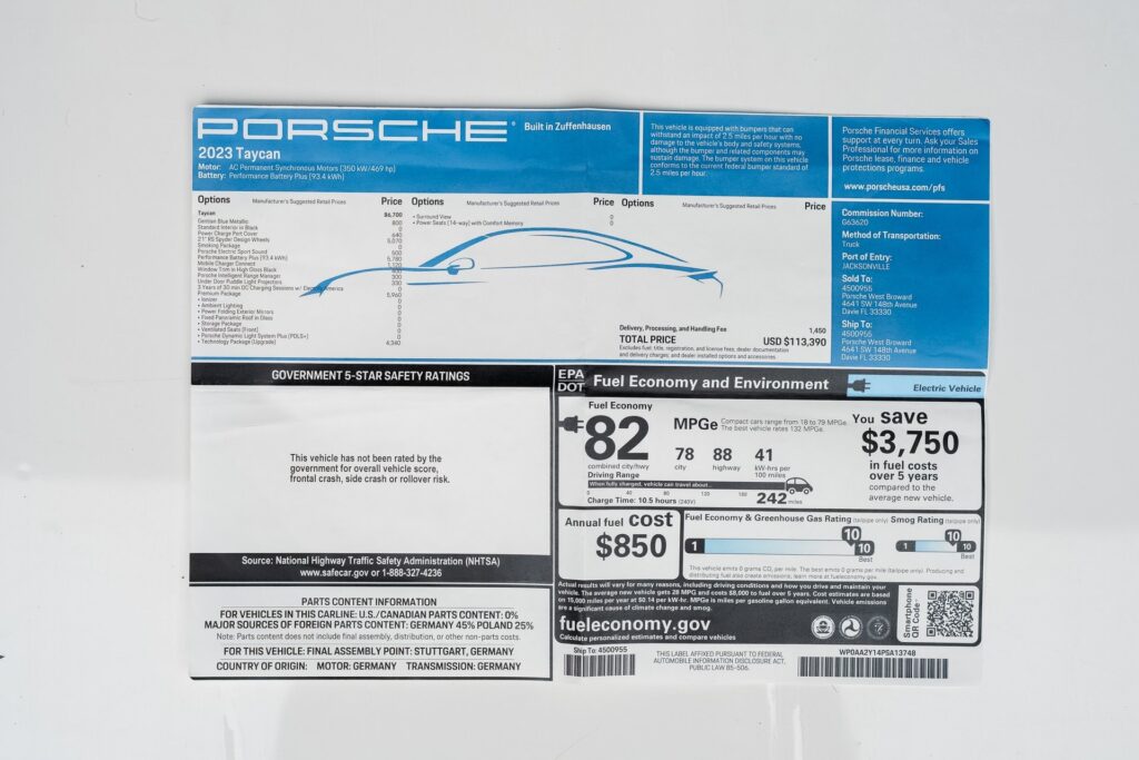 Welcome to TxtCharlie, your go-to place for purchasing cars in Fort Lauderdale. Our showroom is located at 2125 S Federal Highway, Fort Lauderdale, FL 33316, just 5 minutes from Fort Lauderdale Airport. We make out-of-state sales easy with nationwide shipping. To help you get a better feel for our inventory, we offer Facetime calls for virtual tours. Our reputation speaks for itself with over 1000 Google reviews at 5 stars. We offer competitive, no-haggle pricing to take the stress out of buying a car. Our dealer fee is $1,399. Drop by to see our collection, and let us make your car-buying experience smooth and enjoyable. Private Tag Agency Fee of $399 in Florida State or $499 out of State.CARFAX One-Owner. Blue 2023 Porsche Taycan RWD 2-Speed Automatic Electric MotorABS brakes, Alloy wheels, Compass, Electronic Stability Control, Front dual zone A/C, Heated door mirrors, Heated front seats, Illuminated entry, Low tire pressure warning, Porsche Communication Management, Remote keyless entry, Traction control.Recent Arrival! Odometer is 3058 miles below market average!