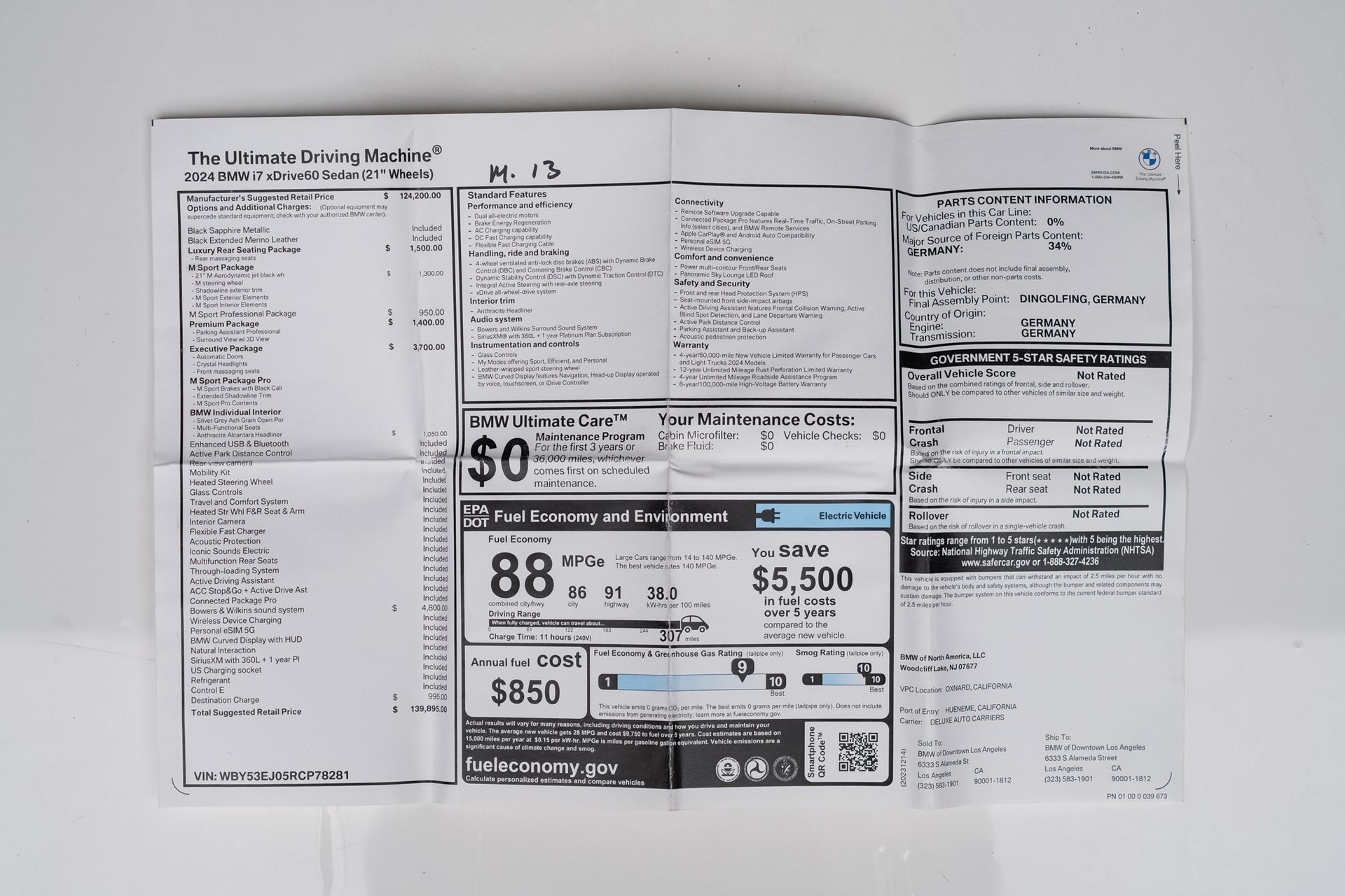 Welcome to TxtCharlie, your go-to place for purchasing cars in Fort Lauderdale. Our showroom is located at 2125 S Federal Highway, Fort Lauderdale, FL 33316, just 5 minutes from Fort Lauderdale Airport. We make out-of-state sales easy with nationwide shipping. To help you get a better feel for our inventory, we offer Facetime calls for virtual tours. Our reputation speaks for itself with over 1000 Google reviews at 5 stars. We offer competitive, no-haggle pricing to take the stress out of buying a car. Our dealer fee is $1,399. Drop by to see our collection, and let us make your car-buying experience smooth and enjoyable. Private Tag Agency Fee of $399 in Florida State or $499 out of State.CARFAX One-Owner. Black Sapphire Metallic 2024 BMW i7 xDrive60 AWD Single-Speed Automatic Electric Motor