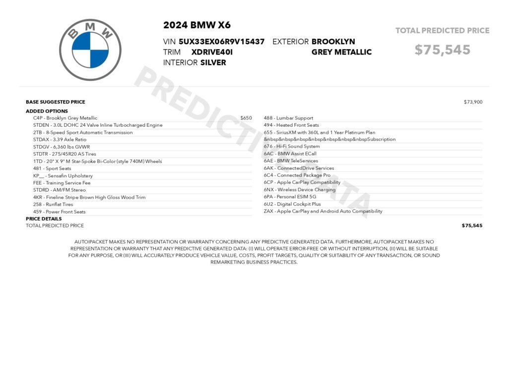 Welcome to TxtCharlie, your go-to place for purchasing cars in Fort Lauderdale. Our showroom is located at 2125 S Federal Highway, Fort Lauderdale, FL 33316, just 5 minutes from Fort Lauderdale Airport. We make out-of-state sales easy with nationwide shipping. To help you get a better feel for our inventory, we offer Facetime calls for virtual tours. Our reputation speaks for itself with over 1000 Google reviews at 5 stars. We offer competitive, no-haggle pricing to take the stress out of buying a car. Our dealer fee is $1,399. Drop by to see our collection, and let us make your car-buying experience smooth and enjoyable. Private Tag Agency Fee of $399 in Florida State or $499 out of State.Clean CARFAX. CARFAX One-Owner. 2024 BMW X6 xDrive40i AWD 8-Speed Automatic Sport 3.0L DOHC 24VLeather.Recent Arrival!