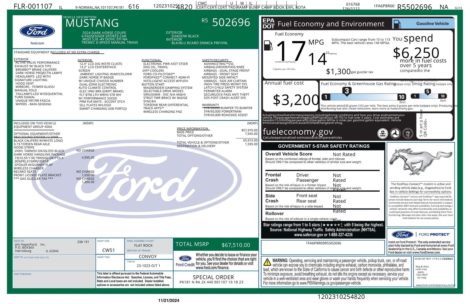 Welcome to TxtCharlie, your go-to place for purchasing cars in Fort Lauderdale. Our showroom is located at 2125 S Federal Highway, Fort Lauderdale, FL 33316, just 5 minutes from Fort Lauderdale Airport. We make out-of-state sales easy with nationwide shipping. To help you get a better feel for our inventory, we offer Facetime calls for virtual tours. Our reputation speaks for itself with over 1000 Google reviews at 5 stars. We offer competitive, no-haggle pricing to take the stress out of buying a car. Our dealer fee is $1,399. Drop by to see our collection, and let us make your car-buying experience smooth and enjoyable. Private Tag Agency Fee of $399 in Florida State or $499 out of State.Clean CARFAX. Shadow Black 2024 Ford Mustang Dark Horse RWD Tremec 6-Speed Manual 5.0L V8 DOHC 32VRecent Arrival!ADDED OPTIONS