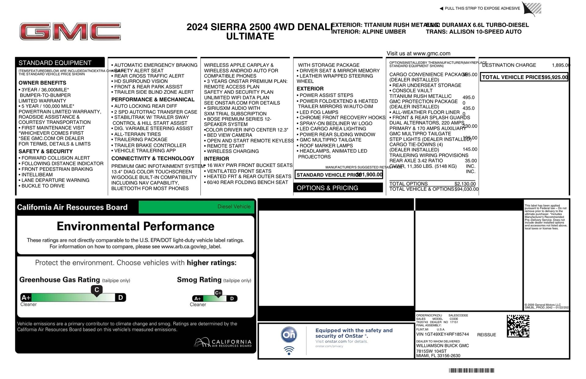 Welcome to TxtCharlie, your go-to place for purchasing cars in Fort Lauderdale. Our showroom is located at 2125 S Federal Highway, Fort Lauderdale, FL 33316, just 5 minutes from Fort Lauderdale Airport. We make out-of-state sales easy with nationwide shipping. To help you get a better feel for our inventory, we offer Facetime calls for virtual tours. Our reputation speaks for itself with over 1000 Google reviews at 5 stars. We offer competitive, no-haggle pricing to take the stress out of buying a car. Our dealer fee is $1,399. Drop by to see our collection, and let us make your car-buying experience smooth and enjoyable. Private Tag Agency Fee of $399 in Florida State or $499 out of State.Clean CARFAX. Titanium Rush Metallic 2024 GMC Sierra 2500HD Denali Ultimate 4WD 10-Speed Automatic Duramax 6.6L V8 Turbodiesel10-Speed Automatic, 4WD, Alpine Umber Leather.Recent Arrival!ADDED OPTIONS