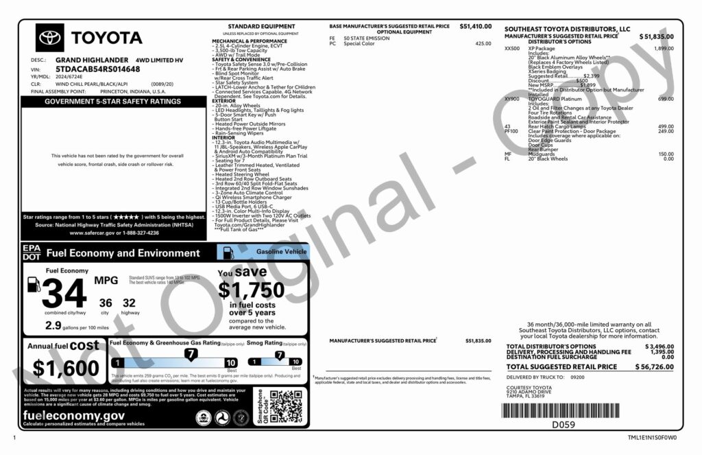 Welcome to TxtCharlie, your go-to place for purchasing cars in Fort Lauderdale. Our showroom is located at 2125 S Federal Highway, Fort Lauderdale, FL 33316, just 5 minutes from Fort Lauderdale Airport. We make out-of-state sales easy with nationwide shipping. To help you get a better feel for our inventory, we offer Facetime calls for virtual tours. Our reputation speaks for itself with over 1000 Google reviews at 5 stars. We offer competitive, no-haggle pricing to take the stress out of buying a car. Our dealer fee is $1,399. Drop by to see our collection, and let us make your car-buying experience smooth and enjoyable. Private Tag Agency Fee of $399 in Florida State or $499 out of State.CARFAX One-Owner. White 2024 Toyota Grand Highlander Hybrid XLE AWD Continuously Variable (ECVT) 2.5L 4-Cylinder2.5L 4-Cylinder.Recent Arrival! Odometer is 20923 miles below market average!