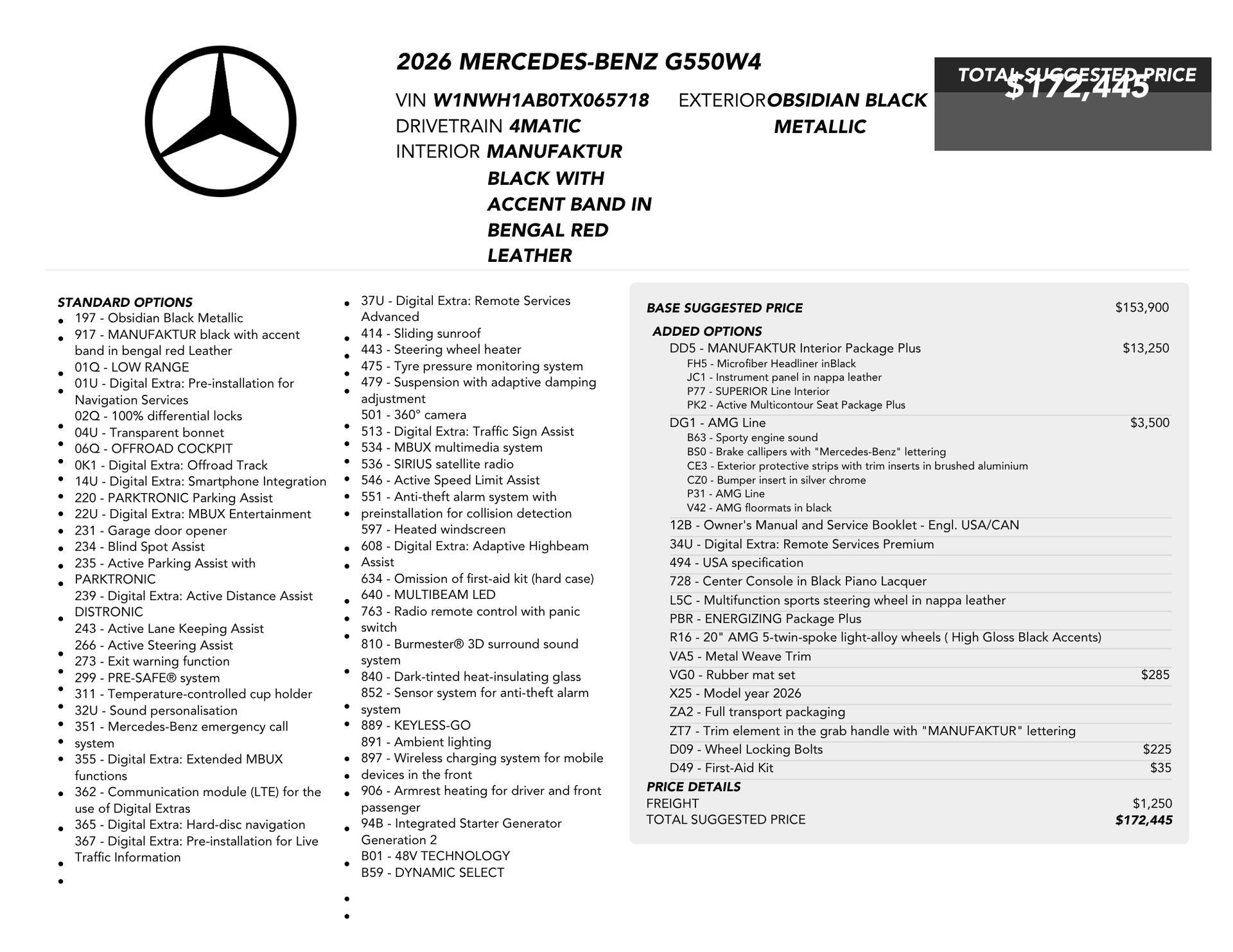 Welcome to TxtCharlie, your go-to place for purchasing cars in Fort Lauderdale. Our showroom is located at 2125 S Federal Highway, Fort Lauderdale, FL 33316, just 5 minutes from Fort Lauderdale Airport. We make out-of-state sales easy with nationwide shipping. To help you get a better feel for our inventory, we offer Facetime calls for virtual tours. Our reputation speaks for itself with over 1000 Google reviews at 5 stars. We offer competitive, no-haggle pricing to take the stress out of buying a car. Our dealer fee is $1,399. Drop by to see our collection, and let us make your car-buying experience smooth and enjoyable. Private Tag Agency Fee of $399 in Florida State or $499 out of State.Clean CARFAX. CARFAX One-Owner. 2026 Mercedes-Benz G-Class G 550 4MATIC® 4MATIC® 9-Speed Automatic 3.0L I6 TurboRecent Arrival!ADDED OPTIONS